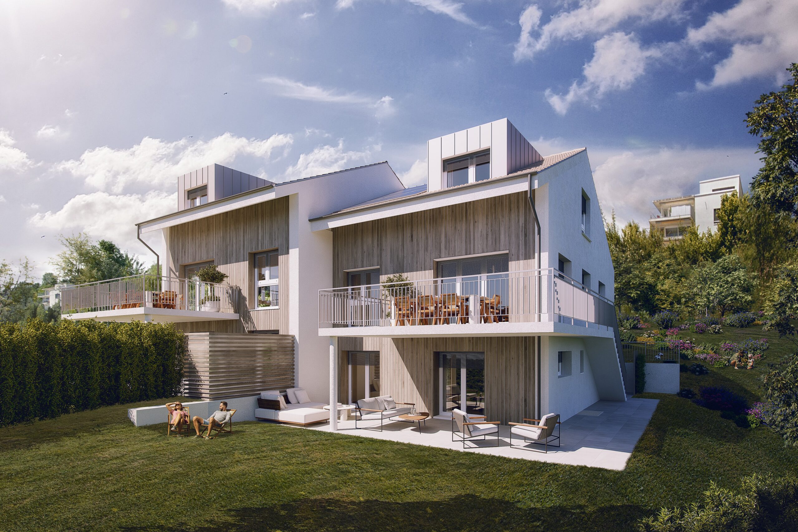 Deux villas jumelées de 5.5 pièces d’inspiration contemporaine, conçues avec une attention particulière portée à la lumière, aux volumes et aux matériaux.