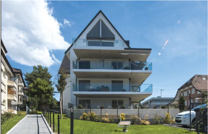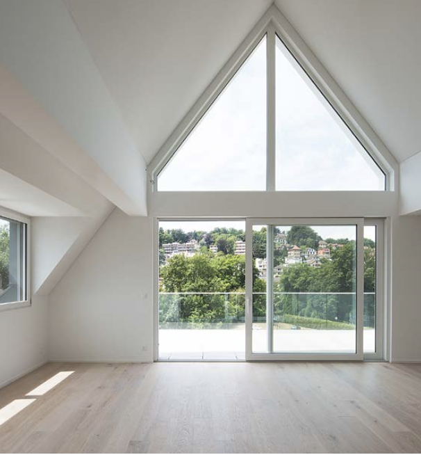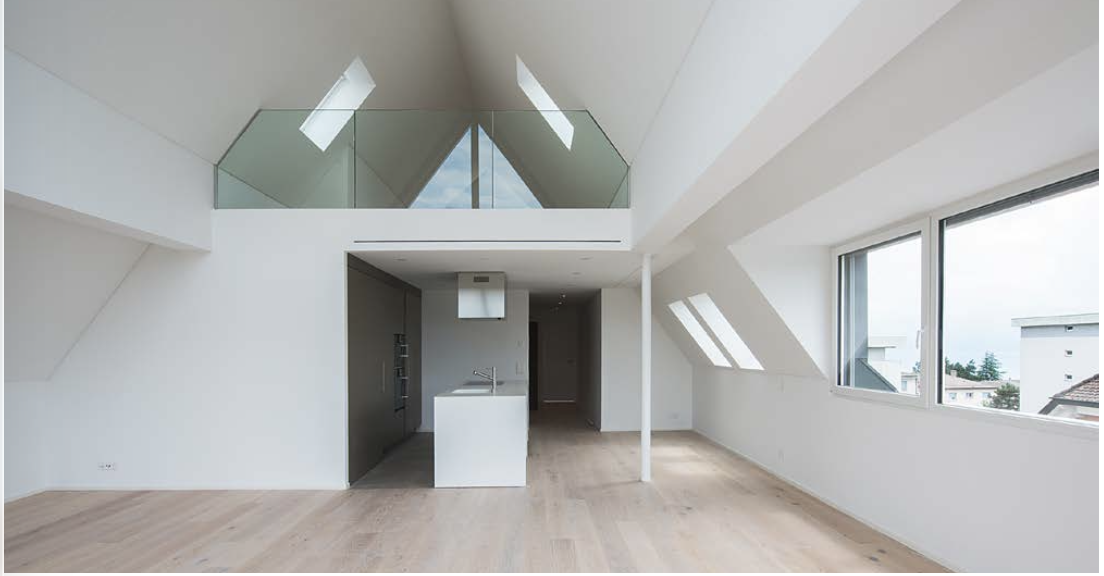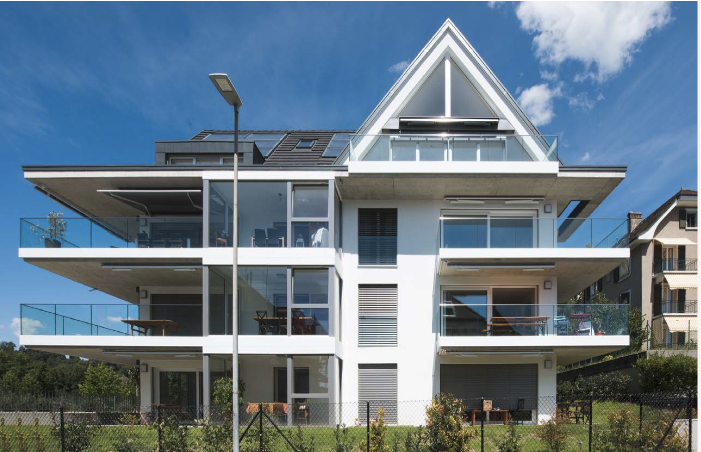 Afin d’optimiser la surface disponible et la vue en front de lac, le bâtiment est construit en forme de T, une longue barre abrite 3 grands logements de 3 pièces et, perpendiculaire, une barre plus petite abrite 3 appartements de 3 pièces plus compacts.